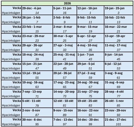 Inträffar det att Du inte erhållit nyckeln då din vecka börjar, kontakta då din granne som står före dig i listan nedan. Hoppa ej över din vecka.